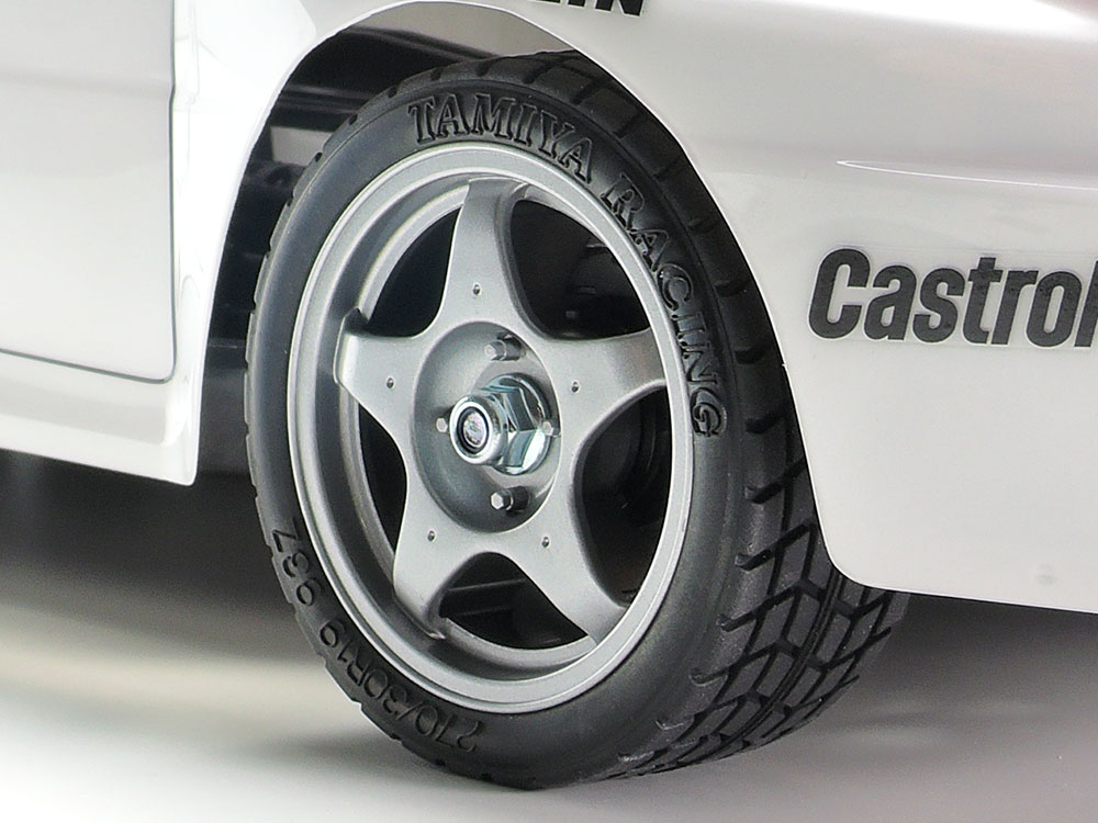 The shaft-driven 4WD TT-02 chassis employs a longitudinal layout with the battery on the left and the motor on the right, to give excellent stability. In addition, it features identical left and right suspension arms and uprights for ease of assembly, plus easy-to-maintain gearboxes. It is a highly adaptable chassis, as it offers 2 different wheelbases, 2 ground clearance settings and 2 tread set-ups in addition to a range of 10 possible gear ratios. It is not short on looks either, with brake disc-shaped wheel hubs and stylish front bumper supports. 5-spoke wheels are paired with tread-patterned tires.