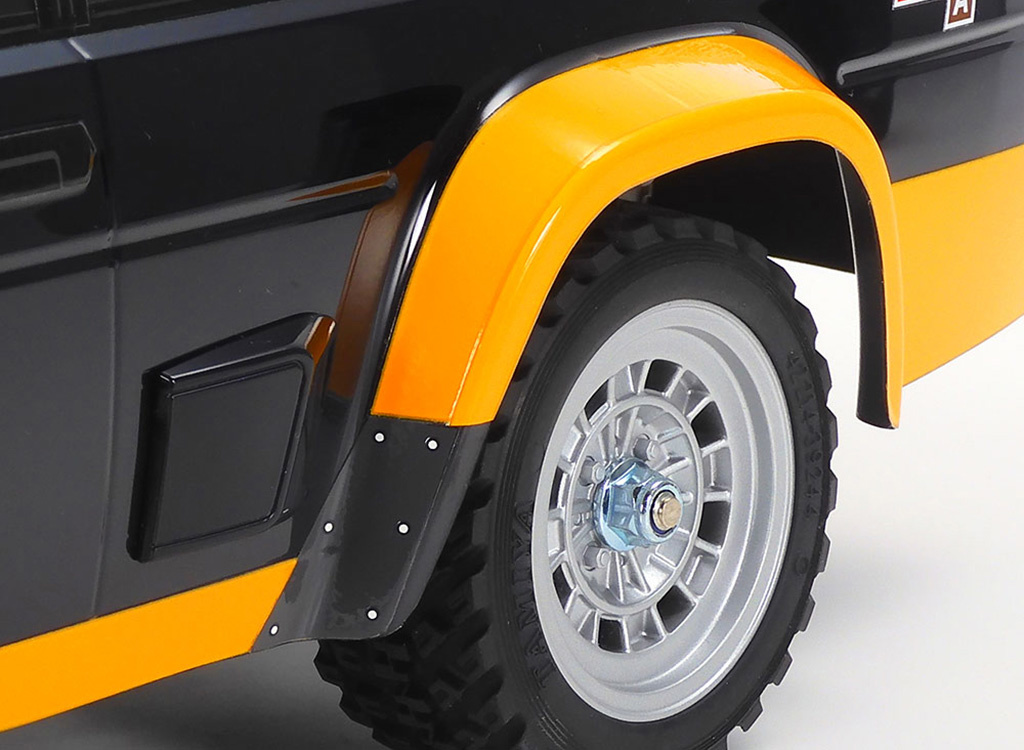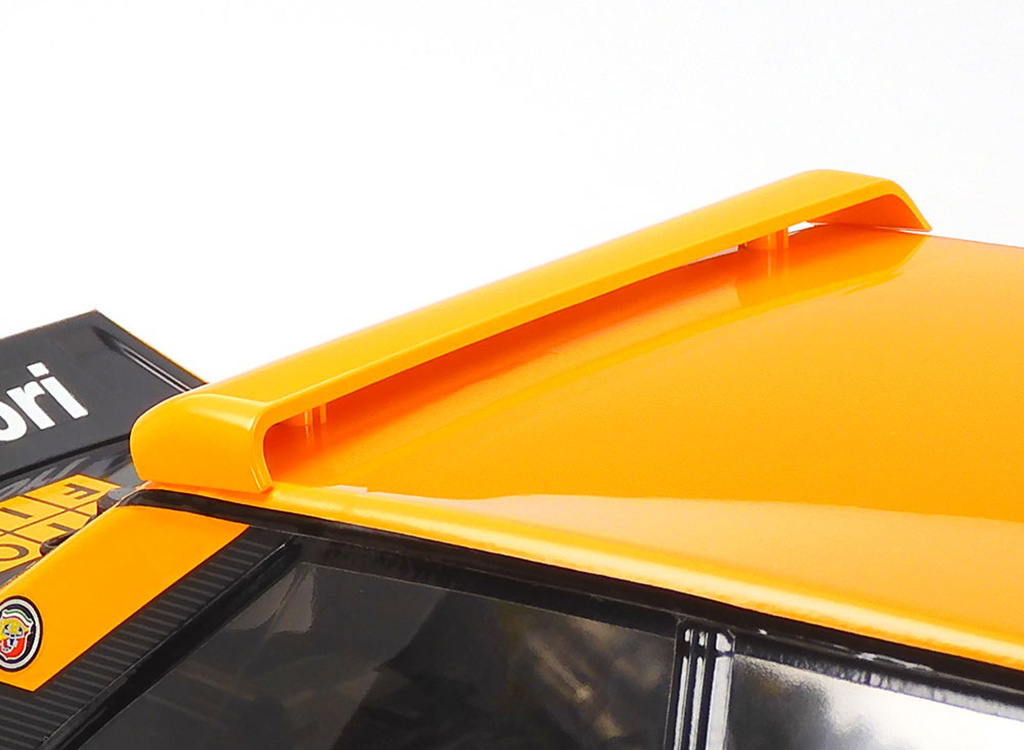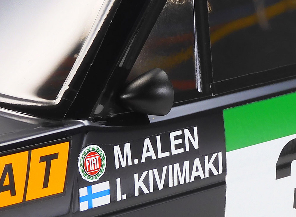 The Fiat 131 Abarth Rally made its debut in 1976 global rally races and became champion three times. Based upon the well-loved Fiat family car 131 Mirafiori, the rally version was customized by Abarth and in 1976 and 1977, it mainly raced in the livery of the Fiat oil brand Olio Fiat: this assembly kit creates an R/C model of that car. The alluring shape of the car is recreated using a polycarbonate body, with separate parts for quadruple headlights, spotlights and roof spoiler.