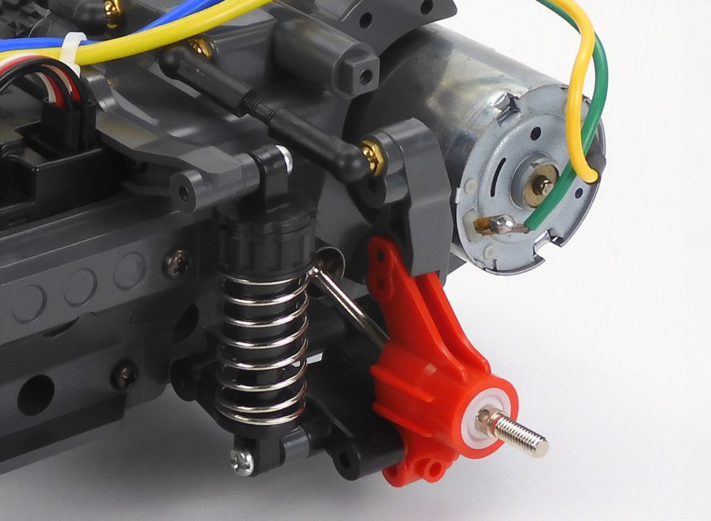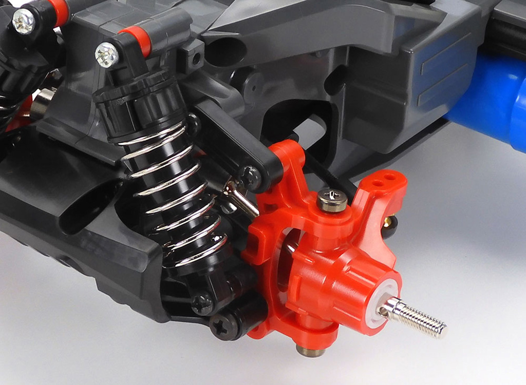 Based around a tough monocoque frame with integrated gearboxes, this compact 4WD chassis gives a thrilling drive whether you take it on road or flat dirt surfaces. It features a rear-mounted motor, with gear-driven rear wheels and a propeller shaft taking power to the front. Both front and rear gearboxes have differential gears. The battery pack location in the chassis center secures excellent balance, while 4-wheel independent double wishbone suspension employs friction dampers. Off-road capable M-05Ra chassis uprights and hub carriers are also included, and dish wheels are paired with rally block tires.