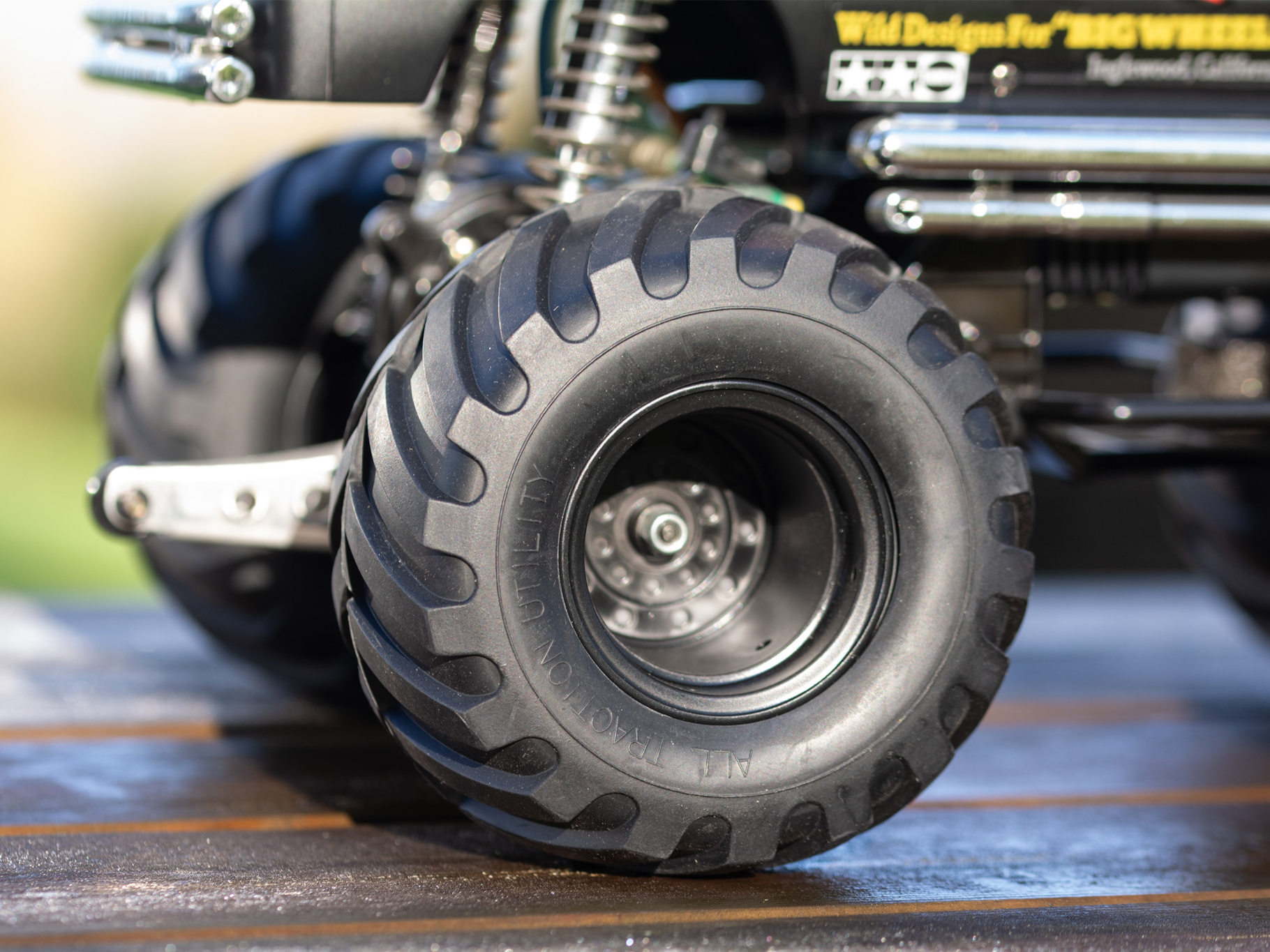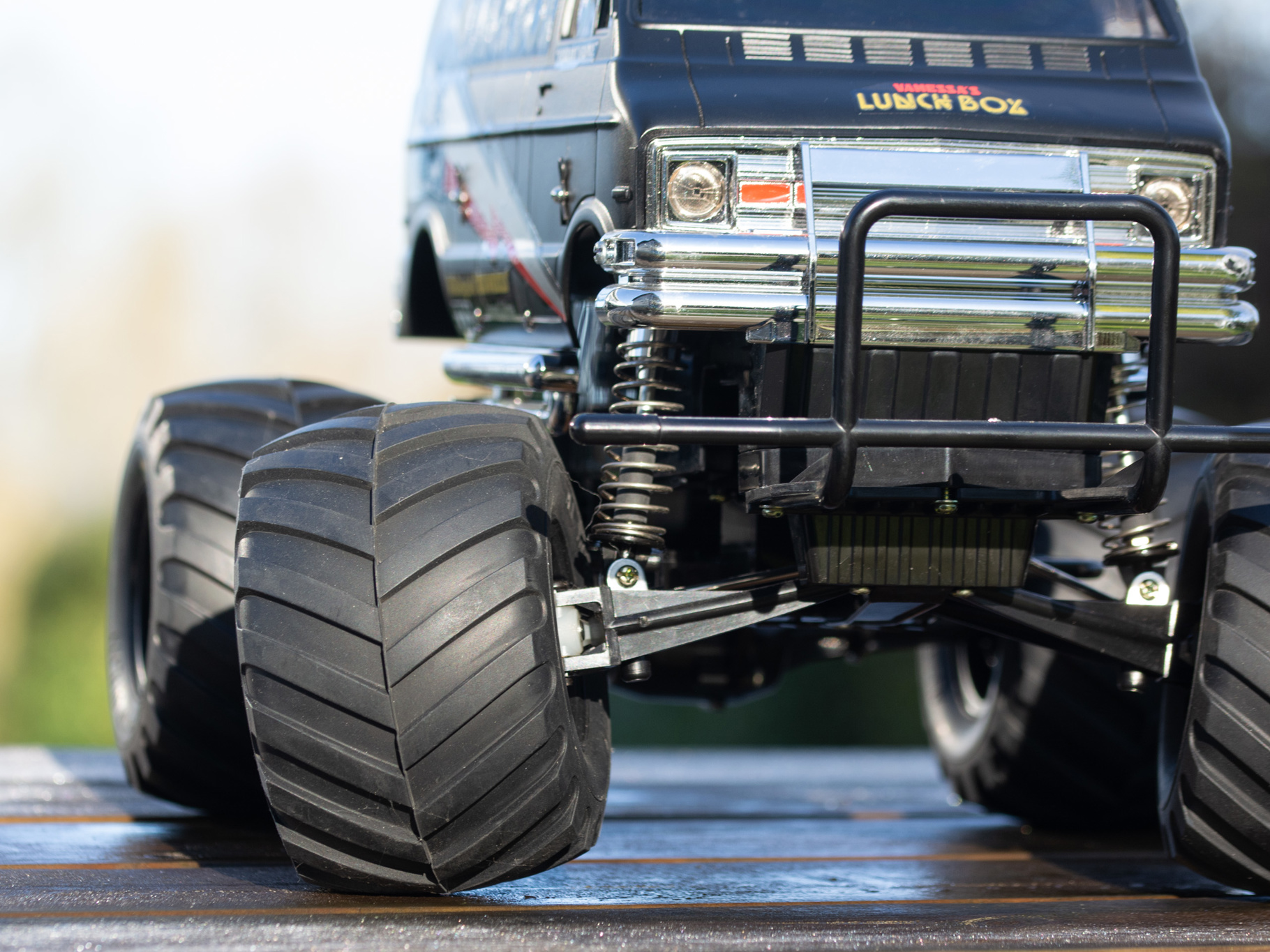 The popular Lunchbox model from Tamiya’s catalog makes a comeback in stylish black. This R/C assembly kit features the trademark boxy minivan body with metal-plated fenders, front grille and dampers, and includes a sticker set to add the finishing touches. All this is raised up over monster truck wheels cased in 115mm tires for a cool number that you can take for a spin any time, anywhere.