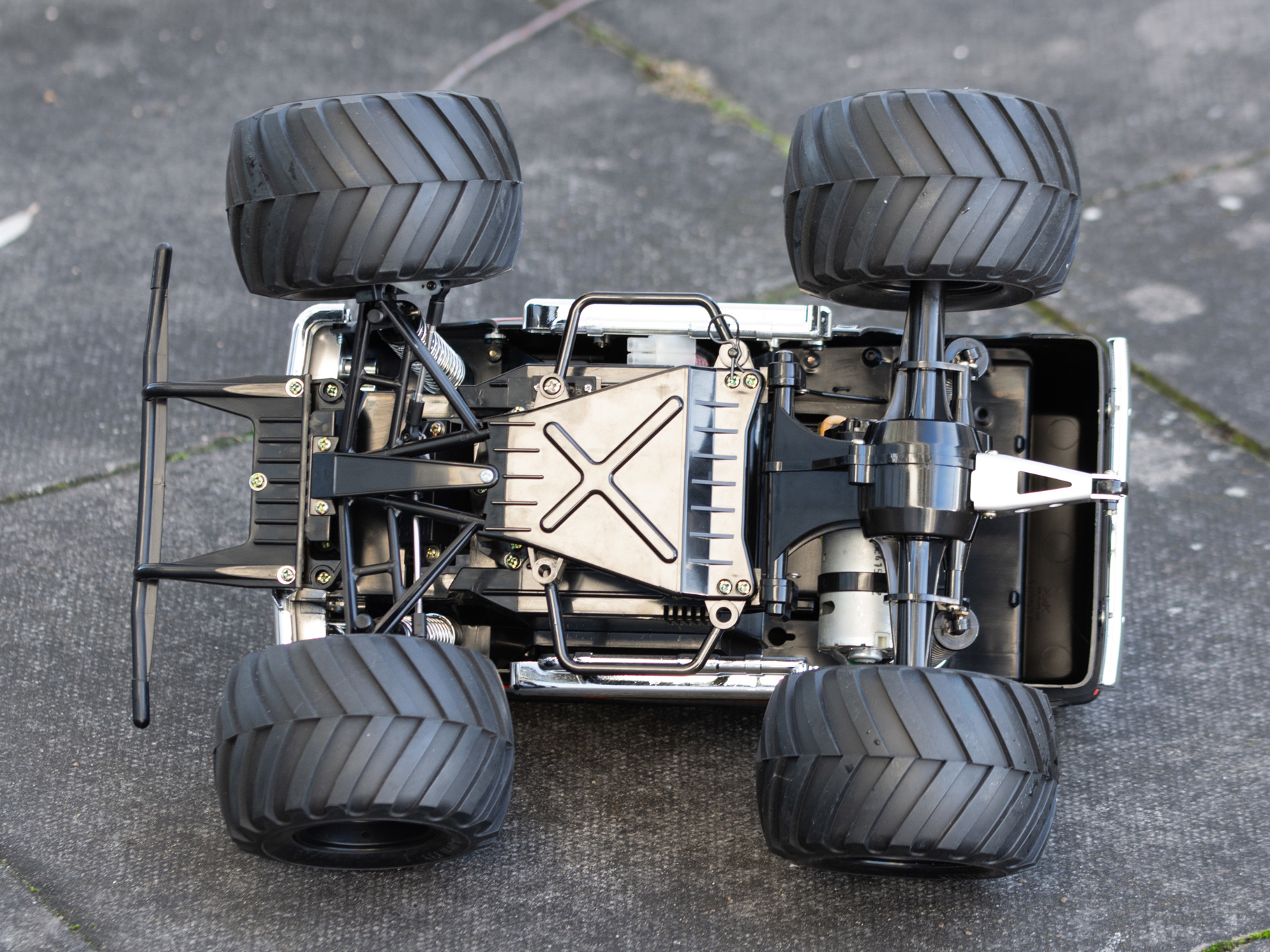 The durable and easy-to-assemble 2WD chassis employs a box type frame, front swingarm independent and rear rolling rigid suspension. Big 115mm diameter semi-pneumatic tires on black wheels offer dynamic running on even the toughest of surfaces. The sealed gearbox protects diff gear from dirt and sand during off-road driving and a rear mounted wheelie bar enables wild wheels in the air stunt driving.