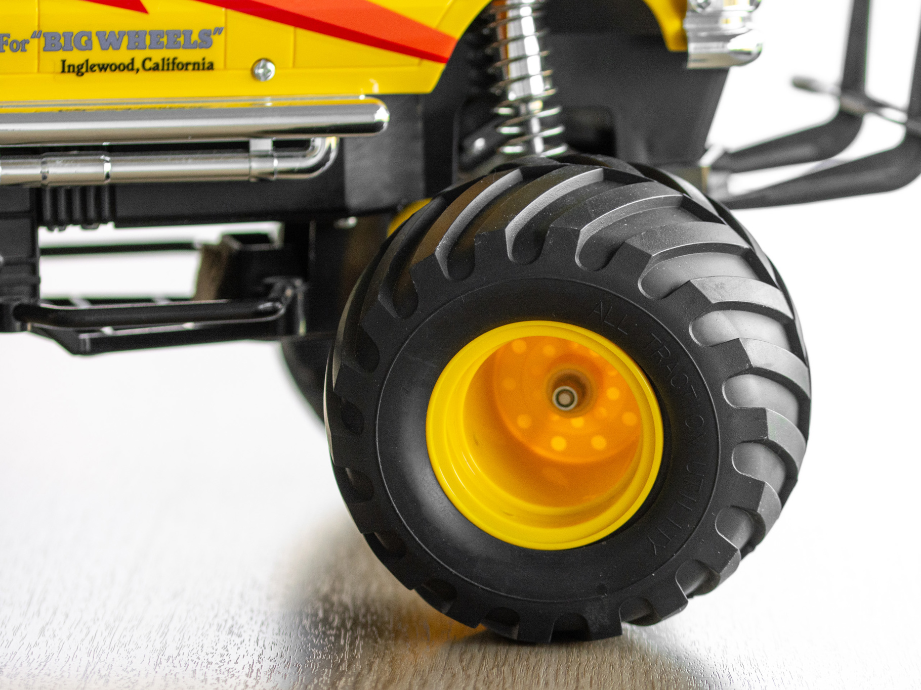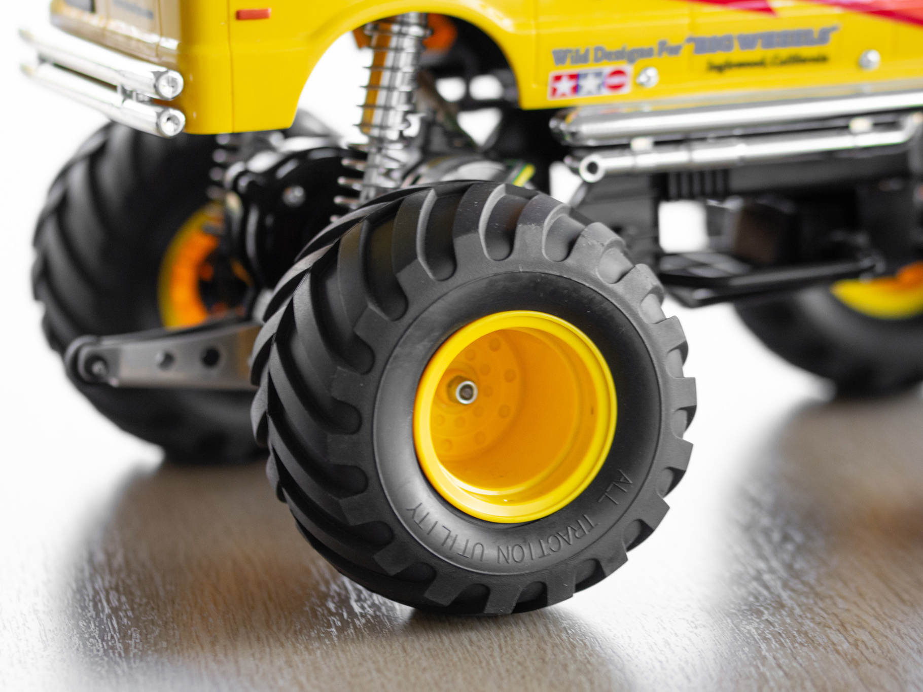The durable and easy-to-assemble 2WD chassis employs a box type frame, and features front independent swingarms and a rear rolling rigid suspension. Big 115mm diameter tires offer dynamic running on even the toughest of surfaces. Sealed gearbox protects the diff gear from dirt and sand during off-road driving. Rear mounted wheelie bar enables wild stunt driving.