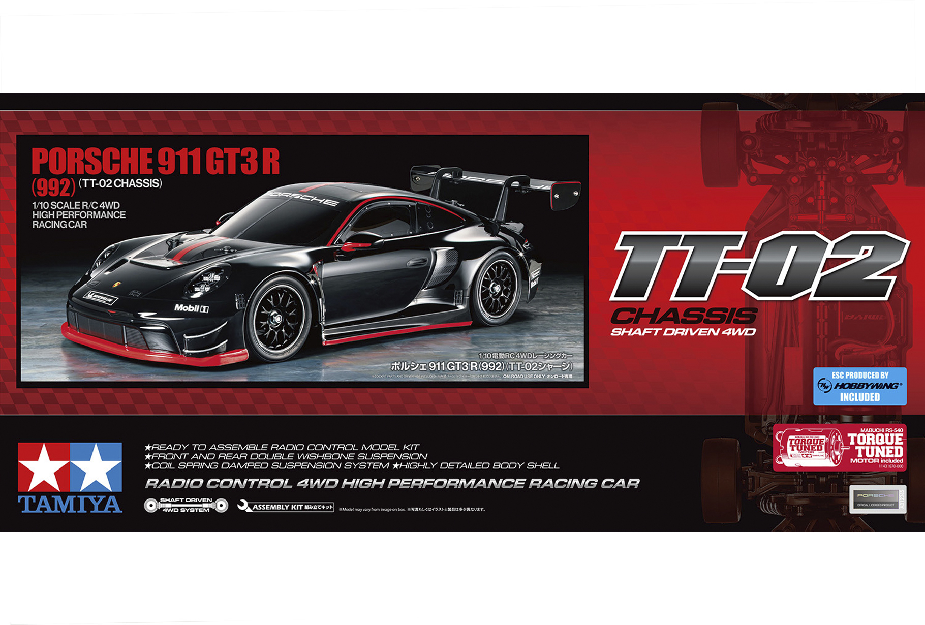 This assembly kit R/C model recreates the the Porsche 911 GT3 R (992), a race-spec version of the 911 which was announced in July 2022. A polycarbonate body artfully captures the powerful modern 911 form, with separate polycarbonate light cases and stickers included to recreate details such as the red pinstripes. The TT-02 chassis is a highly adaptable chassis with a 251mm wheelbase for this model.
