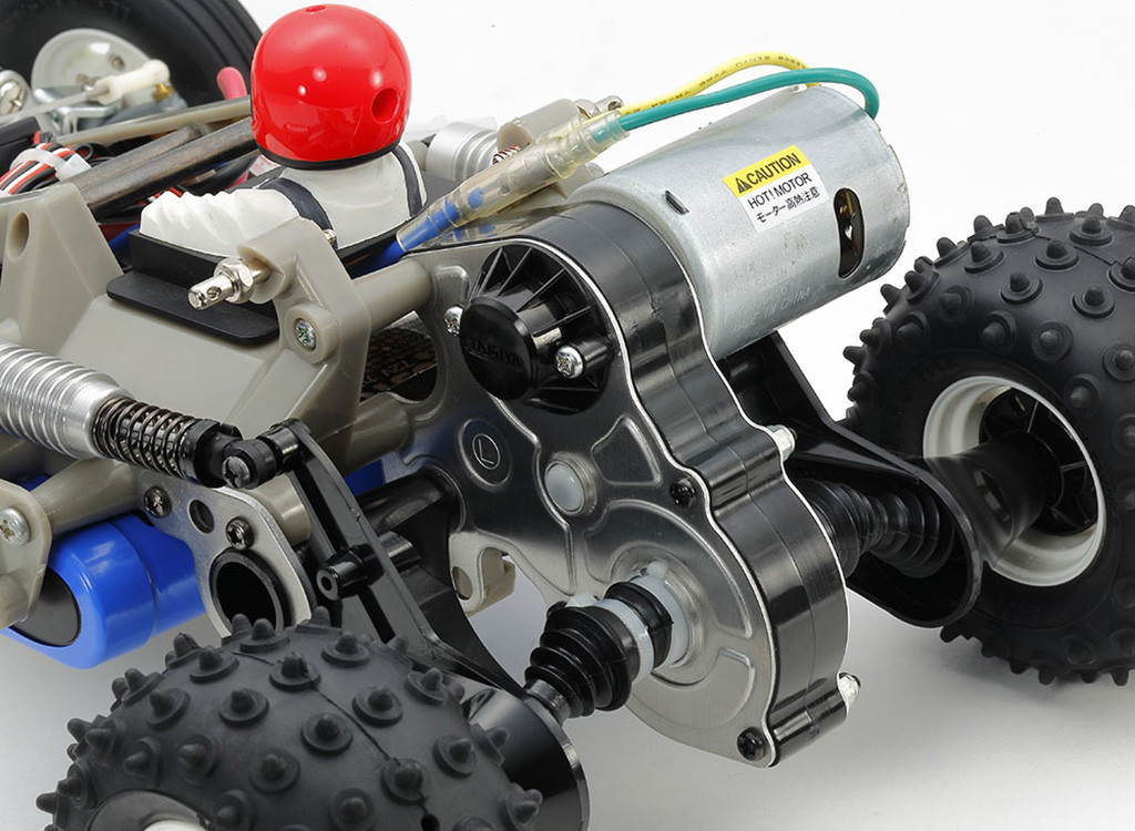 First introduced in 1983, the 2WD racing buggy Frog made a huge splash with its eye-catching design and high performance running. The Frog now makes a comeback, updated for a new age, but with its basic structure essentially unchanged. Preserving its characteristic space frame, the oil dampers for trailing-arm type rear suspension have been updated to diaphragm type. Rear drive shaft features dogbone type joint for secure power transmission. Sleek polycarbonate body remains the same, while 3-piece wheels feature front grooved and rear spike tires for excellent off-road running.