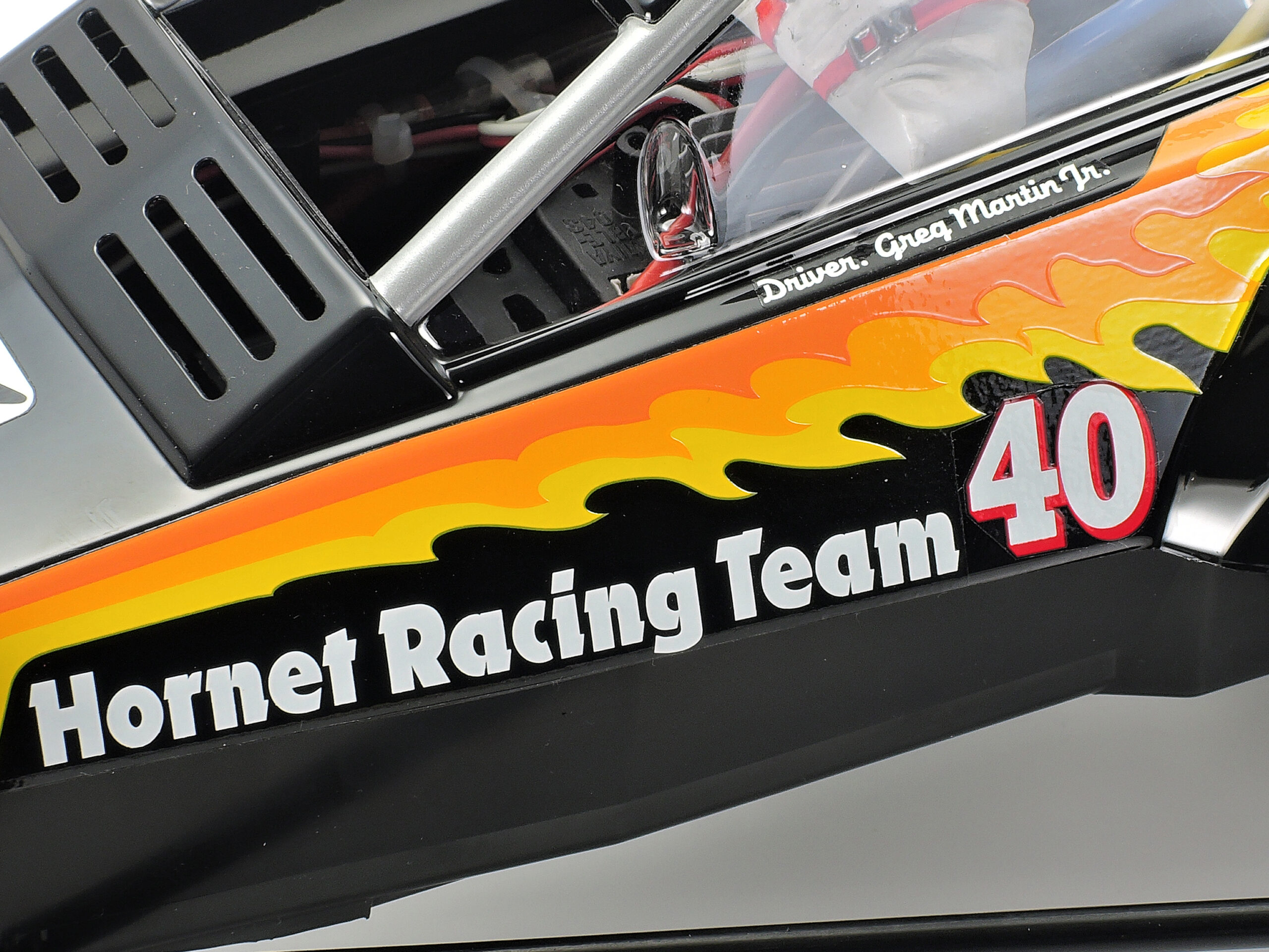 Hornet EVO. uses a lightweight, superbly balanced chassis based around a slim ABS plastic bathtub with the R/C equipment atop the inline battery pack in the lower center; its 4-wheel independent double wishbone suspension uses upper I arms and lower H arms front and rear, with CVA oil dampers making for smooth motion. Turnbuckle upper arms ensure that you can adjust the camber to meet your needs. The motor is mounted in the rear along with a sealed gearbox, and dog bone design drive shafts give an extra layer of reliability, with full ball bearings ensuring efficient drive.