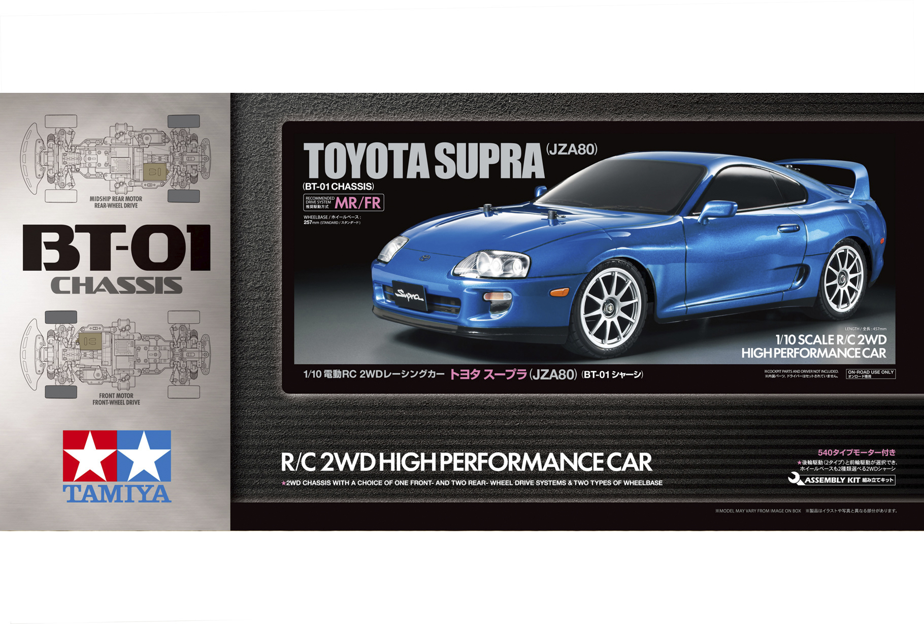 The 2WD BT-01 chassis gives a choice of two types of wheelbase, and front- or rear-wheel drive system. Without removing battery pack, motor and R/C equipment setups from the center frame, simply change attachment directions of final gears and steering linkage to switch between front- and rear-wheel drive; front (FR) or midship rear (MR) motor position can be chosen for rear-wheel drive cars. The 4-wheel double wishbone suspension features symmetrical structure and friction dampers. Unitized sections such as motor mount, final gears and suspension facilitate ease of assembly and effective maintenance. An MR setup is recommended for this model of the Supra, but the FR setup is similar to that of the full-size car and will be worth a try.
