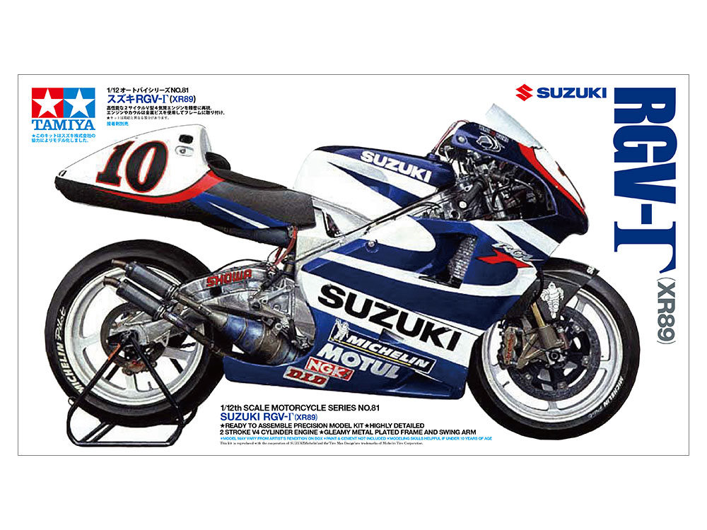 1/12 scale assembly model kit based on the Suzuki RGV-Gamma (XR89). Overall length: 168mm, overall width: 52mm, overall height: 93mm. Model features one-piece upper cowl constructed with the latest in slide-molding technology. All cowling and gas tank can be removed even after assembly, revealing the intricate understructure of this sophisticated recreation. 2-cycle V4 engine features detailed exhaust valve, clutch, air-cleaner, and other parts. Rear suspension uses metal coil spring and is attached to frame with nuts. Decals have been included for drivers Roberts, Jr., Aoki, and Kagayama. Solid rubber used for authentic slick racing tires.