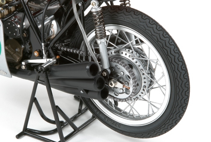 【 About the model 】 ★This is a 1/12 scale plastic assembly kit. Length: 166mm, Width: 43mm. ★Front and rear wheels feature highly detailed flat metal-plated rims and spokes to achieve a realistic finish. ★The air-cooled inline 6-cylinder engine features cooling fins which provide a great scale realism. ★One-piece cowling part helps reproduce bike’s sleek form. ★Solid rubber tires with realistic tread patterns included. ★Photo-etched parts for brake drum air ducts, cowling snaps, and chain sliders as well as metal transfers for rivets are included.
