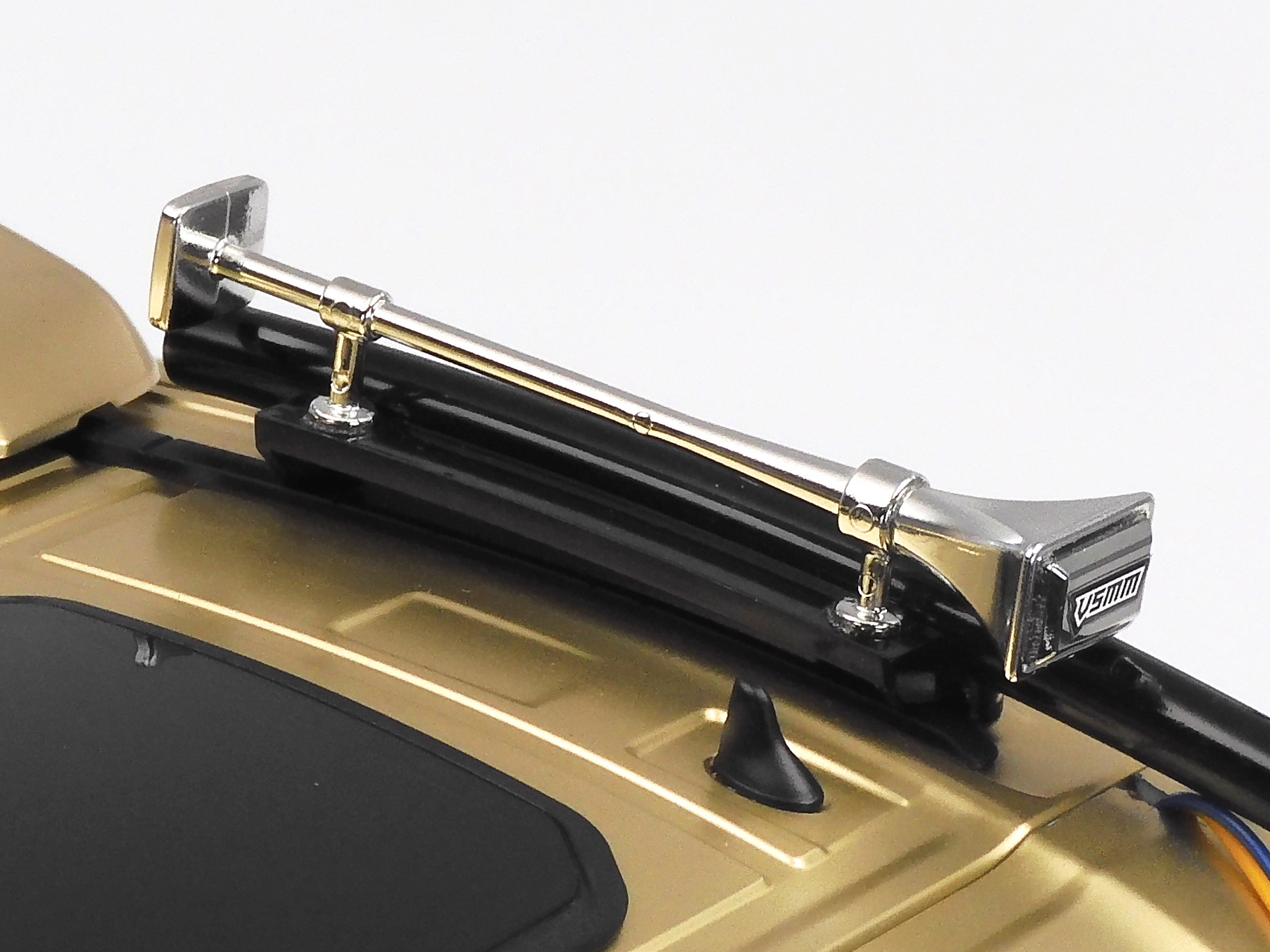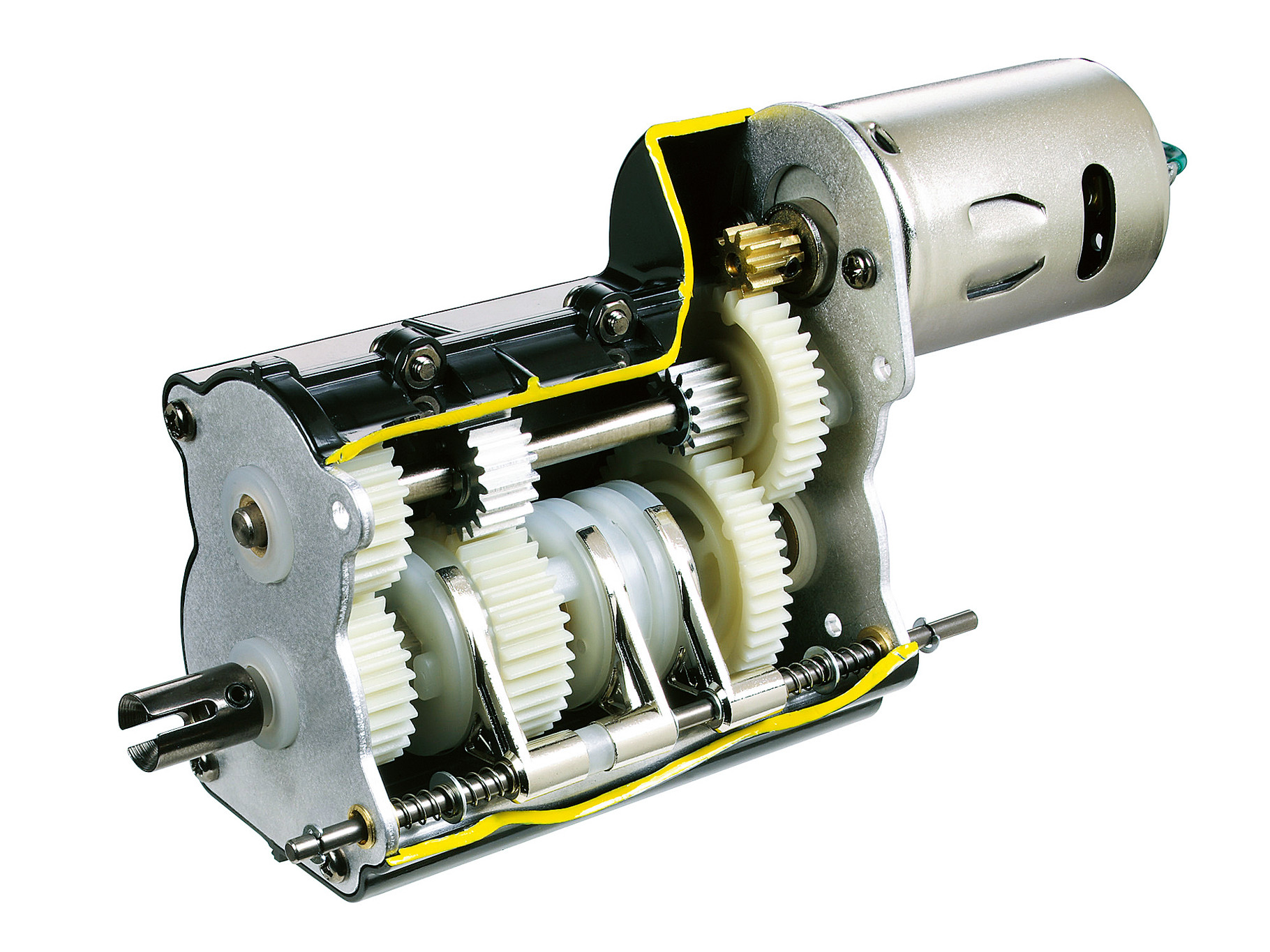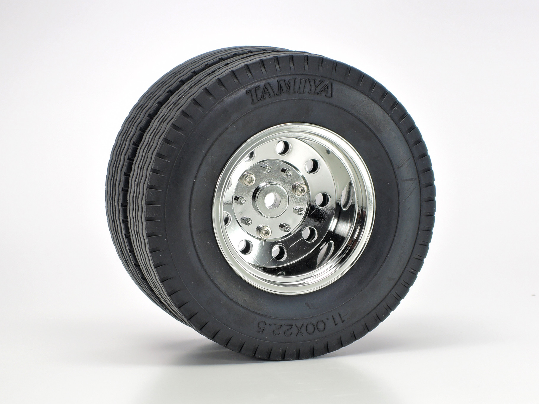 ●Length: 469mm, width: 193mm, height (without side mirrors and antenna): 315mm, weight: approx. 3.5kg ●Wheelbase: 272mm ●Tread: 155mm (front), 138mm (rear, double tire) ●Chassis: aluminum & polycarbonate resin ladder frame ●Suspension: front/rear leaf spring rigid ●Caster angle (front & rear): 0° ●Camber angle (front & rear): 0° ●Toe angle (front & rear): 0° ●Aluminum dummy dampers (front/rear) ●Rear axle drive ●3-gear transmission (gear shifts via transmitter) ●Gear ratio = (1st gear) 32.49:1, (2nd gear) 17.66:1, (3rd gear) 10.66:1 ●3-bevel differential gear ●Type 540 motor ●Tire width/diameter: 30mm/85mm (front); 22mm/84mm (rear) ●TR Mighty-Tuned Motor (35T) ●Tire width/diameter: 30mm/85mm (front), 22mm/83mm (rear)